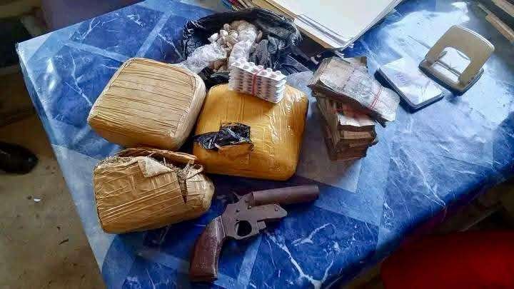 The raid led to the arrest of three suspects and the confiscation of narcotics, cash, and other items, including approximately two and a half plates of compressed marijuana, nine strips of Tramadol, 117 wraps of illicit drugs, a short pump single-barrel gun, LRD 56,600, and a TVS motorbike.